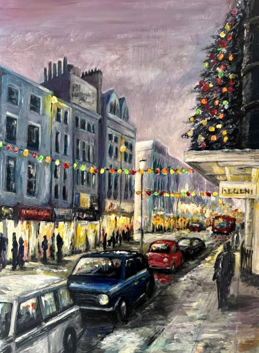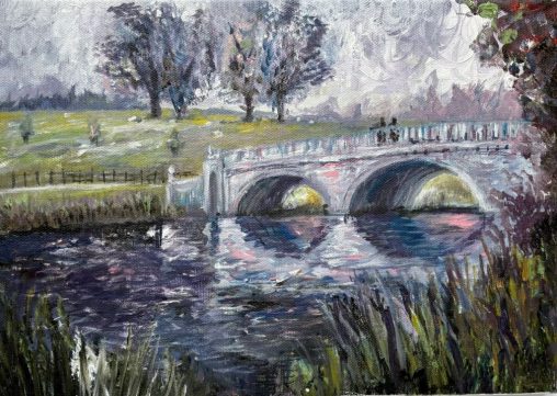 The popular Warwick castle depicted in a wintery scene rather than than more commonly seen ‘summer’ renditions. Painted on board in acrylic.