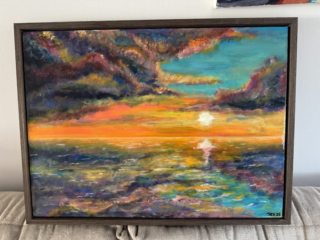 What made this painting more interesting was the use of a resin coating to give and enhanced glossy liquid sheen to the scene.
